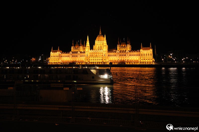 Budapeszt. Pięknie oświetlony nocą budynek Parlamentu, znajdujący się nad brzegiem Dunaju.
