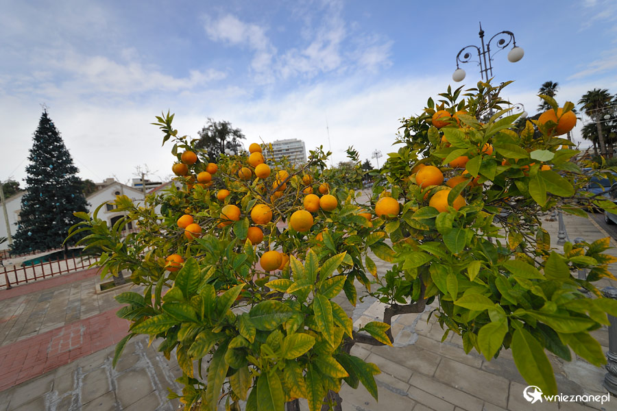 Cypr zimą. Dojrzewające pomarańcze na drzewkach w Larnace.