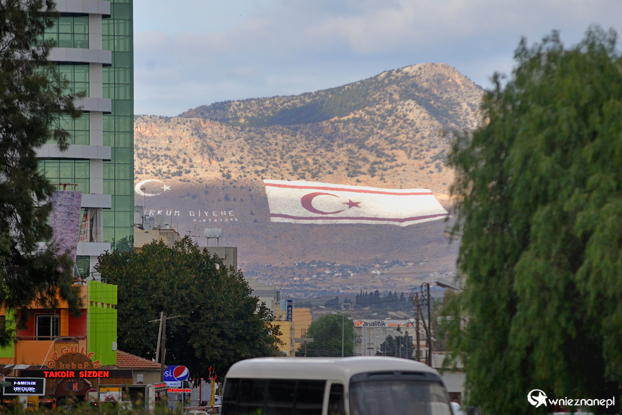 Cypr zimą. Ogromna flaga Cypru Północnego namalowana na górze przy wjeździe do Nikozji ma denerwować Greków i przypominać o okupacji.