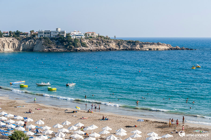 Cypr latem. Piaszczysta plaża Coral Bay przyciąga mnóstwo turystów.