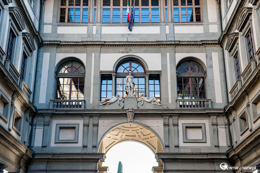 Florencja. Posąg Giotta w niszach Galleria degli Uffizi.
