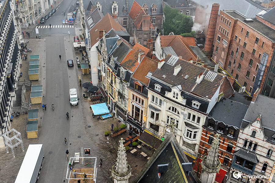 Gandawa (Gent). Widok z dzwonnicy (Belfort en Lakenhalle) na miasto. Z lewej renesansowa fasada ratusza (Stadhuis).