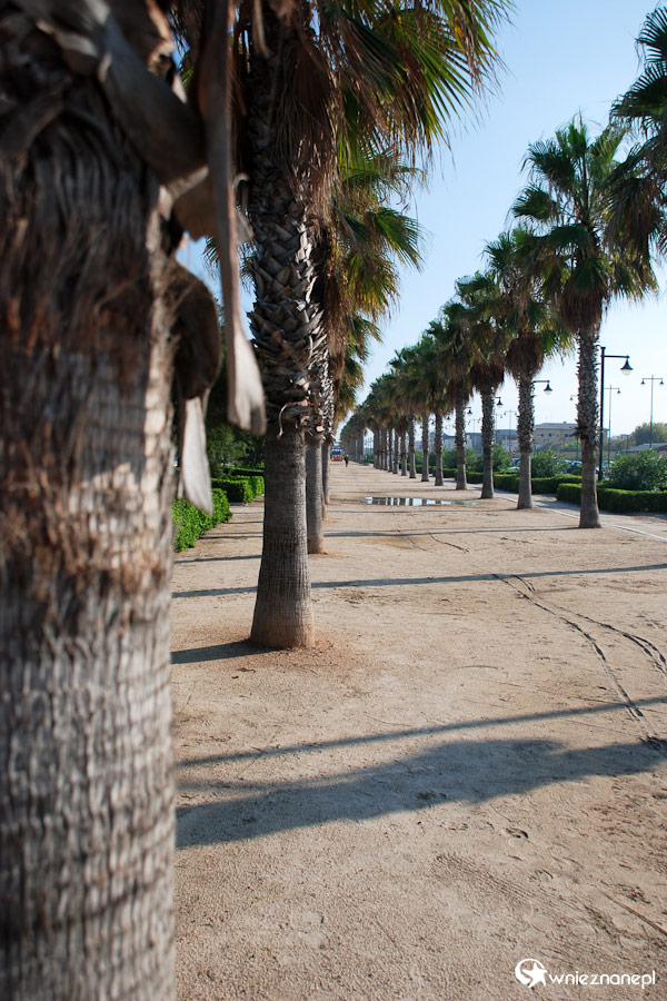 Walencja. Piasczyste alejki z rzędami palm zachęcają do spacerowania promenadą wzdłuż morza.