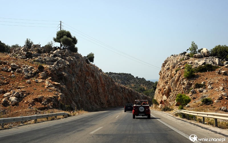 Droga prowadząca na południe wyspy Rodos wzdłuż wybrzeża. Po bokach osypujące się czerwonawe skałki.