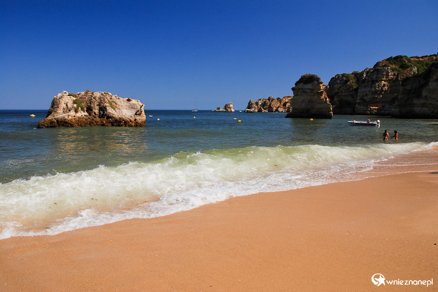 Portugalia. Algarve. Złocisty piasek, skały piaskowca na plaży Dona Ana.
