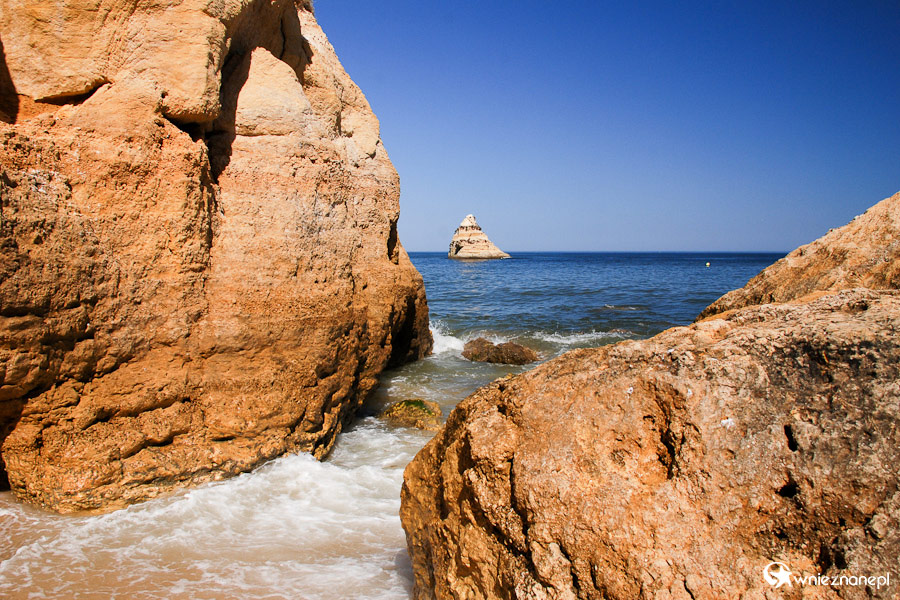 Portugalia. Algarve. Wody oceanu obmywają skały w pobliżu plaży Dona Ana.
