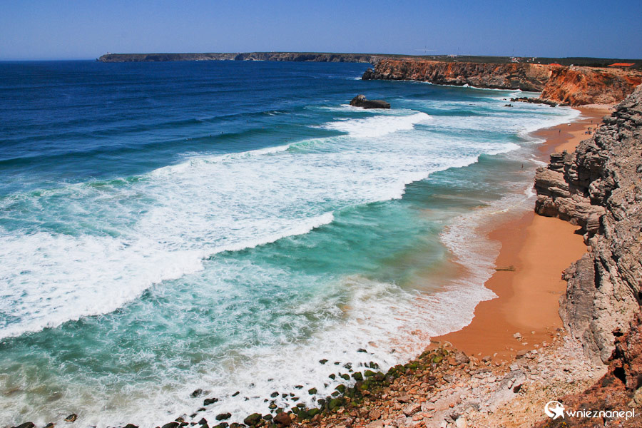 Portugalia. Algarve. Sagres. Piękny widok na okazałe fale oceanu będące celem wielu surferów.