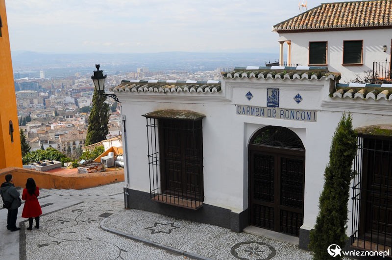 Hiszpania. Widok na miasto w dole z drogi prowadzącej do Alhambry w Granadzie.