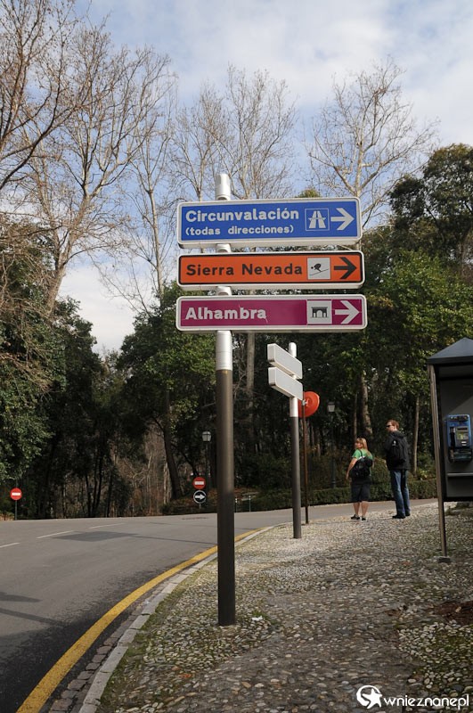 Hiszpania. Znak wskazujący drogę do Alhambry w Granadzie i do gór Sierra Nevada.