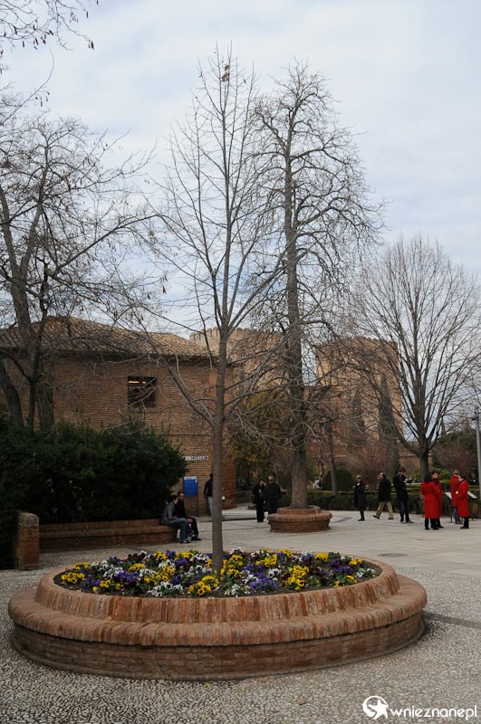 Hiszpania. Kwitnące bratki, bezlistne drzewo i Alhambra w Granadzie.