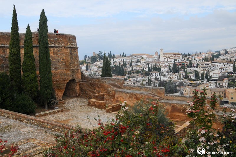 Hiszpania, Granada. Mury Alhambry, w tle widok na miasto.