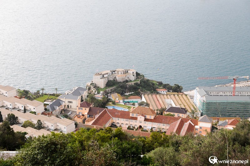 Gibraltar, Upper Rock. Wąska droga i twierdza. W tle zatoka.