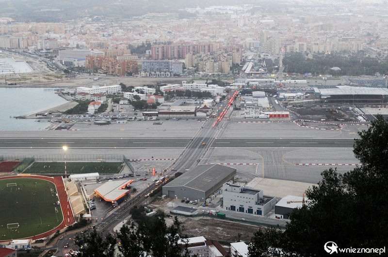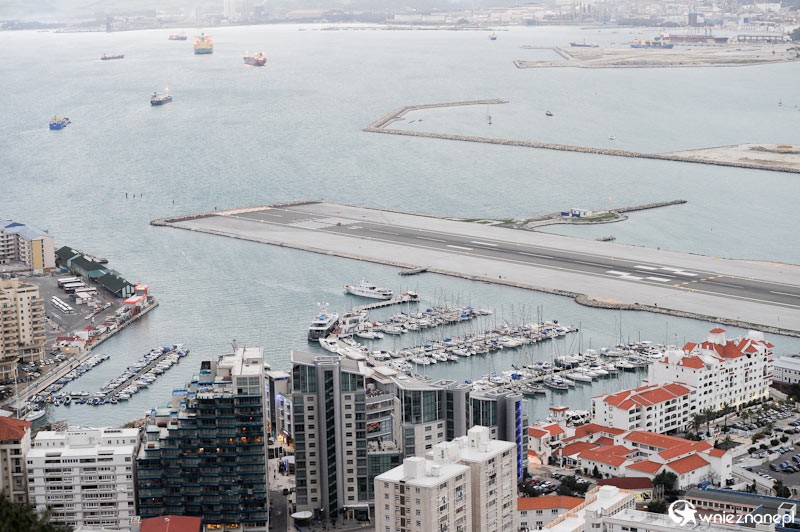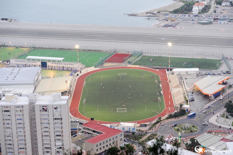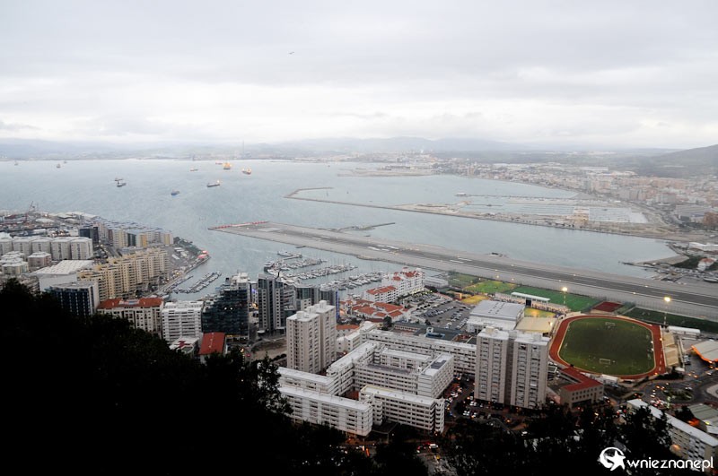 Gibraltar. Widok z Upper Rock na boiska sportowe, pas startowy lotniska i zatokę.