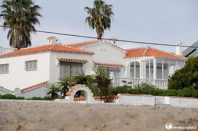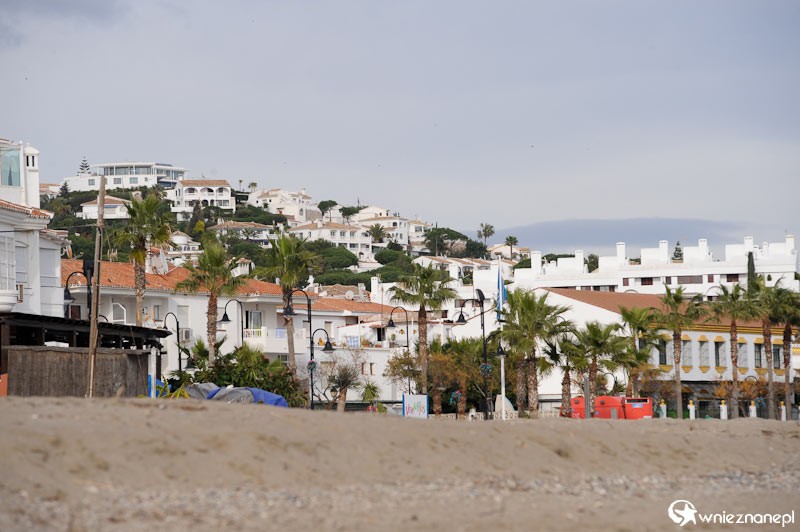 Hiszpania. Widok z plaży w Mijas na biały budynek.