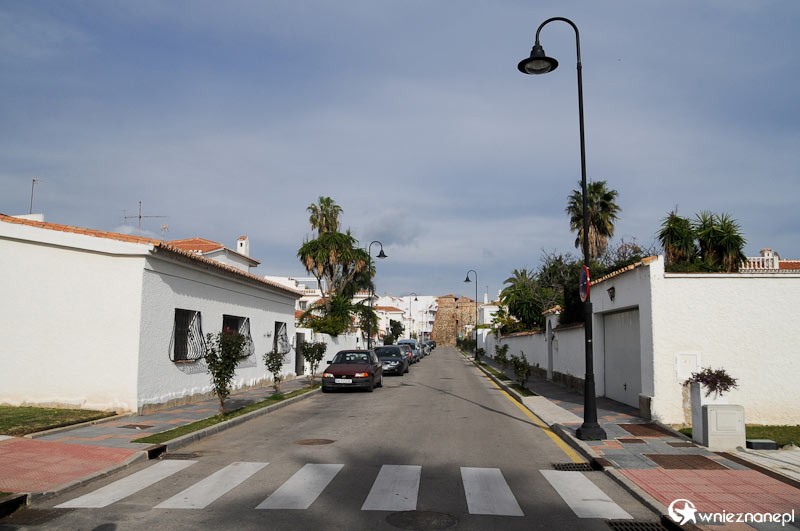Hiszpania. Ulica z białymi domami, przebiegająca wzdłuż plaży.