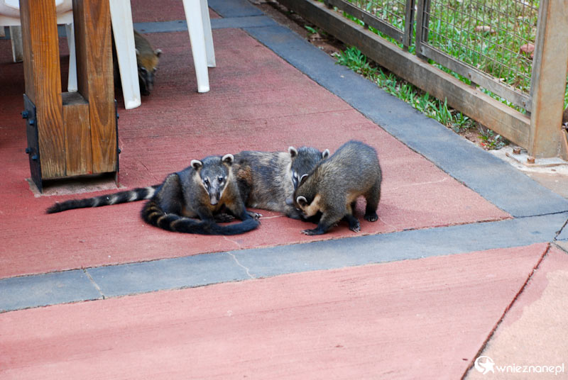 Argentyna. Parque Nacional Iguazu. Urocze Coati tylko czekają, żeby zdobyć pożywienie turystów.