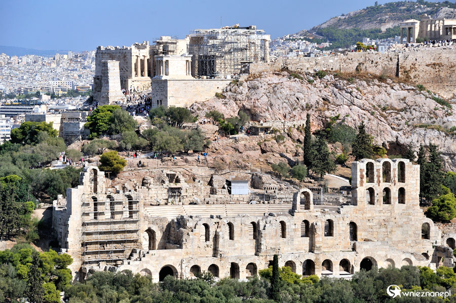 Ateny. Propyleje na Akropolu i Odeon widziane ze Wzgórza Filopapusa.