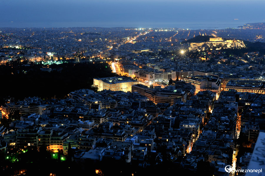Ateny. Nocna panorama Aten widziana ze Wzgórza Likavitos.
