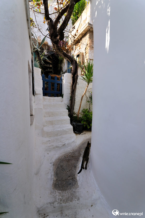 Ateny. Anafiotika. Klimatyczny zaułek, białe domki, schodki i oczywiście kot.