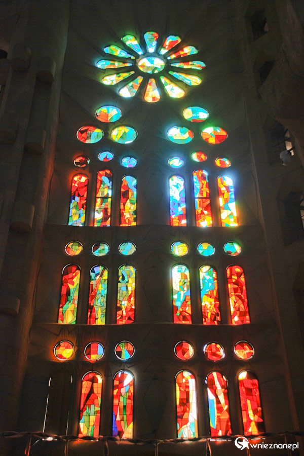 Barcelona. Promienie słońca przebijają się przez kolorowe witraże w Sagrada Familia.