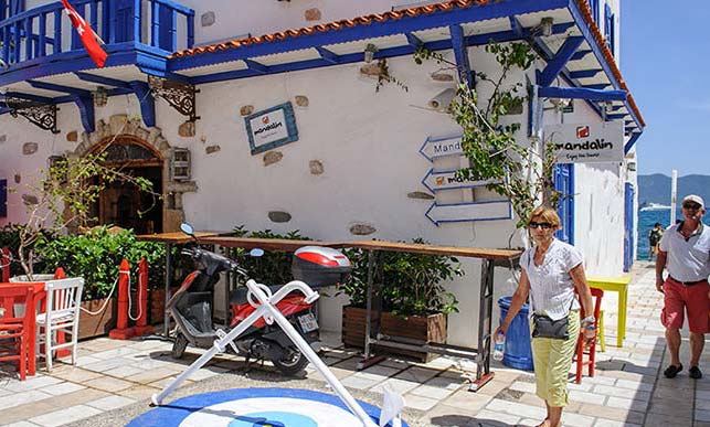Ruszamy na wycieczkę wzdłuż wybrzeża. Mijamy plaże, hotele, malownicze zatoczki. Wreszcie docieramy do kurortu Turgutreis. Jest tu znacznie spokojniej niż w samym Bodrum i raczej sennie. Są hotele, ale też i mniejsze wille i domy wakacyjne. Główną atrakcję stanowi jednak bliskość wyspy Kos - stąd do Grecji jest tylko 5 km, widać więc poszczególne domy na wyspie. Przez całą drogę towarzyszą nam drzewka pomarańczowe z dojrzewającymi owocami. Zdecydowanie warto spróbować soku ze świeżo wyciśniętych owoców - nigdzie indziej, niż w miejscach, gdzie rosną, nie smakuje tak dobrze. Poza tym na piękny pomarańczowo-czerwony kolor kwitną drzewka granatu, ale ich owoce zbierane będą dopiero jesienią.