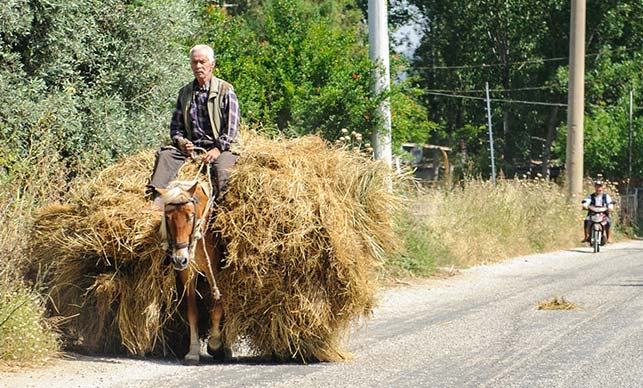 Wystarczyło, żebyśmy skręcili z głównej drogi, by zobaczyć typowy wiejski krajobraz. Spacerujące po drodze krowy, kozy czy owce to standard. Do tego trzeba dodać rozsypujące się chatki czy staruszków z naręczem chrustu idących wzdłuż ruchliwych dróg. Charakterystycznym elementem tureckich wsi są jednak pojazdy, szczególnie te typowo użytkowe. Samochody bez fragmentów karoserii, drzwi, dachu czy szyb *w tym np. przedniej), załadowane po brzegi różnymi towarami nie są tu niczym nadzwyczajnym. Tym razem udało się spotkać jeszcze ciekawszy obrazek - mężczyzna zwoził z pola siano. I naprawdę nie byłoby w tym nic nadzwyczajnego, gdyby nie to, że owo siano poukładał bezpośrednio na grzbiecie konia, a następnie sam usiadł na górze. Dla nas było to o tyle zaskakujące, co zabawne, ale można przypuszczać, że dla miejscowych to zwykły, codzienny obrazek, bo oprócz nas, nikt na pana nawet specjalnie nie patrzył.