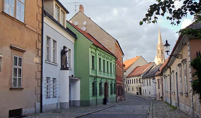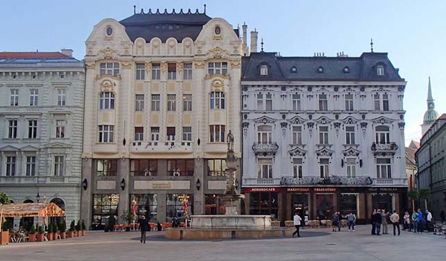 Naszą wyprawę rozpoczęliśmy od udania się w rejon starówki. Po drodze mijamy kościół św. Elżbiety, który ze względu na swój charakterystyczny kolor nazywany jest Niebieskim Kościółkiem (Modrý kostolík). Świątynia została wzniesiona ze środków cesarza Franciszka Józefa, dla uczczenia jego tragicznie zmarłej żony. W pobliżu kościoła na ulicy Grösslingová znajduje się Gymnázium Gamča, które secesyjnym stylem współgra z Niebieskim Kościółkiem.
