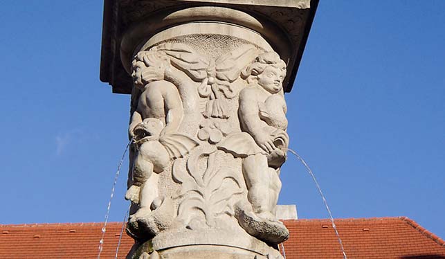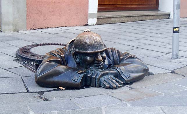 Spod pałacu wąskim przesmykiem tuż przy budynku Wydziału Teologicznego Uniwersytetu Trnawskiego i starego Ratusza dotarliśmy na starówkę, która przywitała nas nie tylko barwnymi kamienicami, ale również zabawnymi pomnikami. O jedną z ławek oparty jest jegomość w nakryciu głowy przypominającym kapelusze Napoleona Bonaparte. W jednej z wąskich uliczek kolejna postać w płaszczu i zwiewnym szaliku kłania się nisko, zdejmując cylinder. Jeszcze ciekawsza jest persona, która spogląda na nas z… wylotu studzienki kanalizacyjnej oparta głową o bruk. Na rynku starego miasta znajdują się także bardziej "poważne” zabytki. Jednym z nim jest pochodząca z XVI w fontanna Rolanda, która przedstawia cesarza Maksymiliana III.
