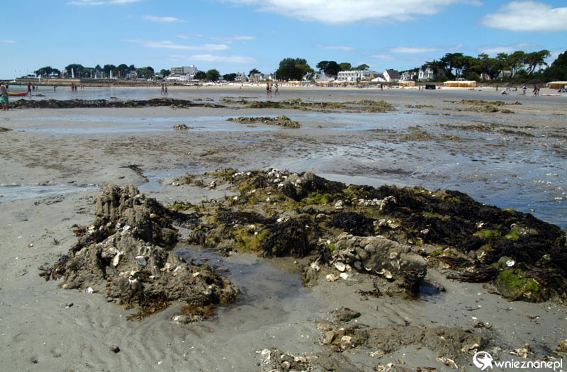 Bretania. Zalewane przez ocean fragmenty plaży i skałek w miejscowości Carnac.