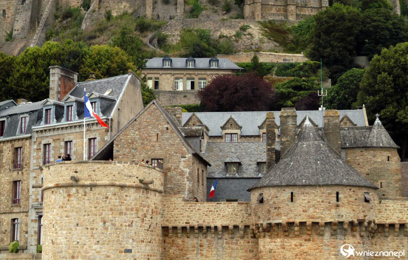 Północna Francja. Przepiękne Mont Saint-Michel. Na pierwszym planie mury i wieże obronne.