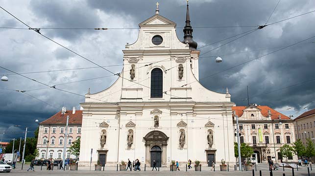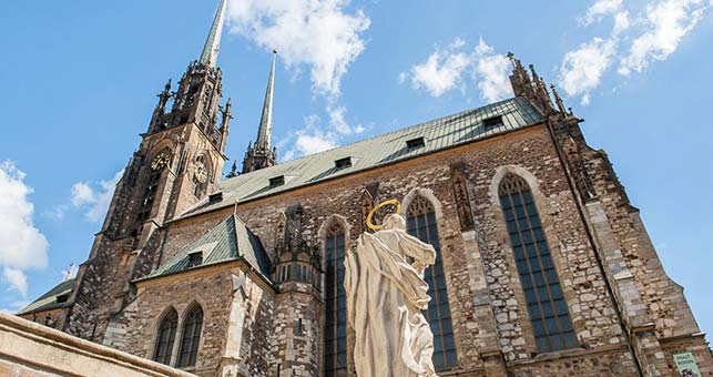 Skręcamy także w inną stronę. Droga pnie się nieco pod górę, aż dochodzimy do Katedry św. Piotra i Pawła. Zbudowana została w miejscu dawnej bazyliki. Sąsiadują z nią inne zabudowania kościelne. Dzwony katedry biją o godzinie 11, upamiętniając nieudany atak Szwedów na Brno w 1645 r. Zarówno wnętrze, jak i wieża katedry są udostępnione do zwiedzania. Z góry rozpościera się wspaniały widok na miasto i okolicę. W gotyckim wnętrzu katedry zwracamy natomiast uwagę na słynną rzeźbę Matki Boskiej z Dzieciątkiem Jezus, pochodzącą z XIV w.