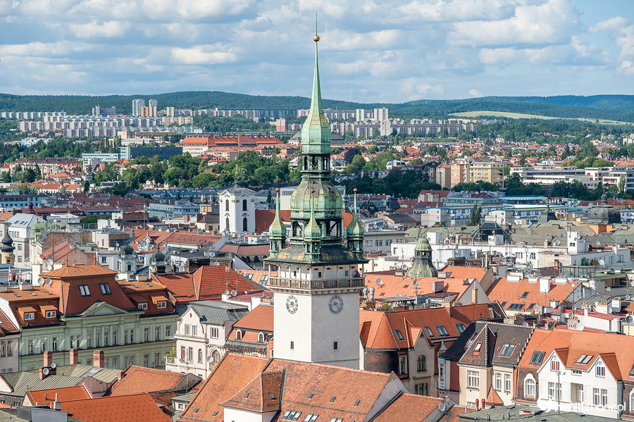 Brno. Panorama miasta z wieży katedralnej. Na pierwszym planie wieża Ratusza.