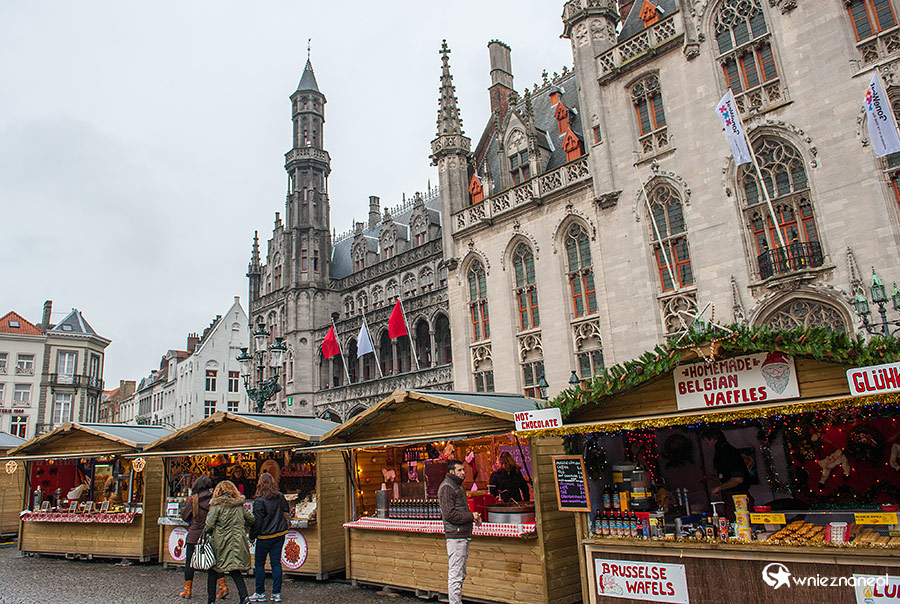 Brugia (Brugge). Zimowy festyn i lodowisko na placu Markt. W tle Provinciaal Hof.