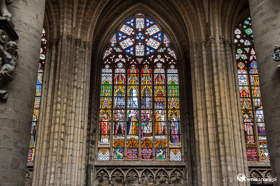 Wspaniałe witraże we wnętrzu Cathedrale des Saints Michel et Gudule.