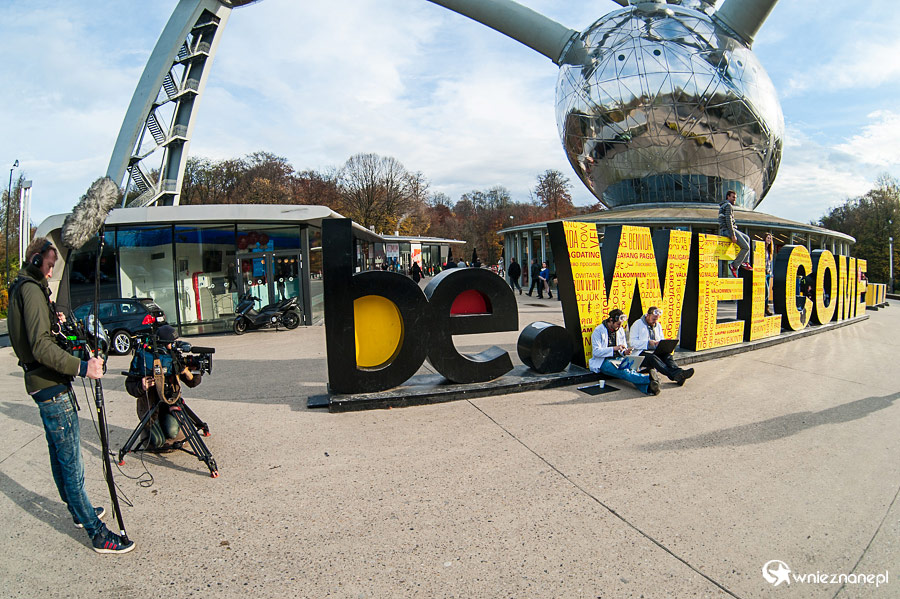 Bruksela. U podnóża Atomium trwa nagranie programu tv.