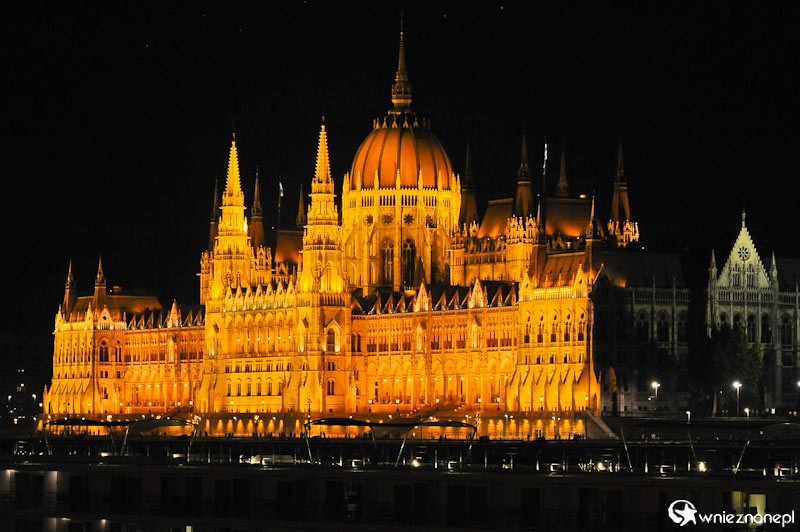 Budapeszt. Pięknie oświetlony nocą budynek Parlamentu, znajdujący się nad brzegiem Dunaju.