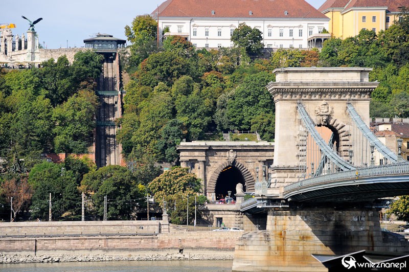Budapeszt. Widok z brzegu Dunaju na Most Lańcuchowy i kolejkę Siklo w tle.