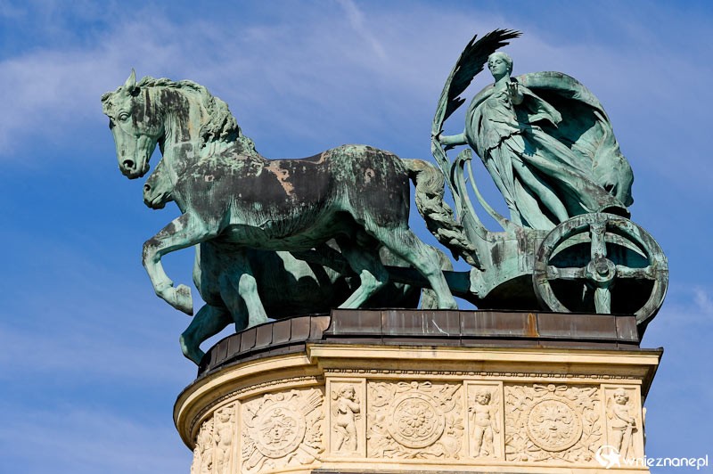 Budapeszt. Imponujący Pomnik Tysiąclecia na Placu Bohaterów (Hosok tere). Wizerunek bogini Pokoju.