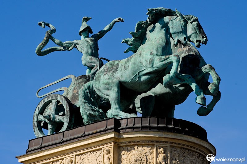 Budapeszt. Imponujący Pomnik Tysiąclecia na Placu Bohaterów (Hosok tere). Wizerunek boga Wojny.