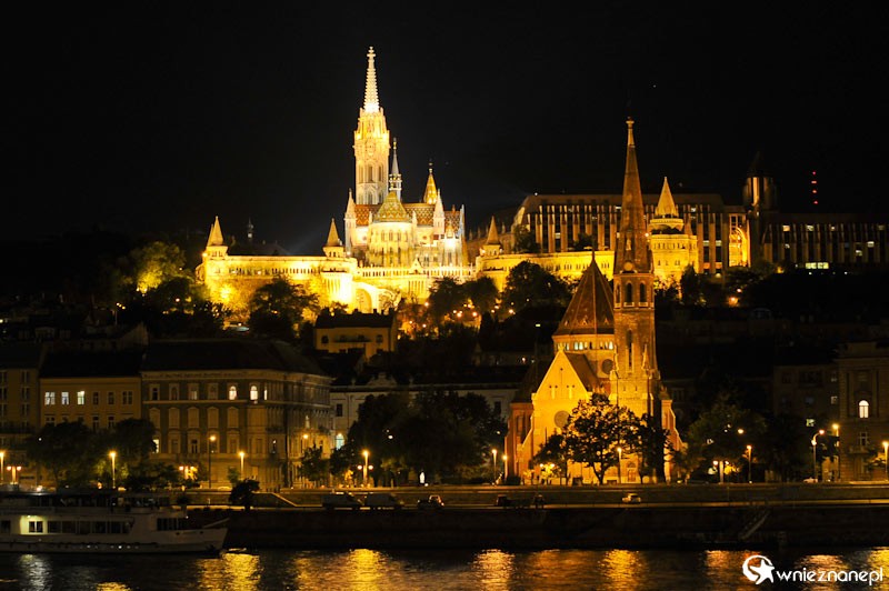 Budapeszt nocą. Pięknie oświetlony Kościół Macieja i Baszta Rybacka. Na pierwszym planie Budai Reformatus templom.