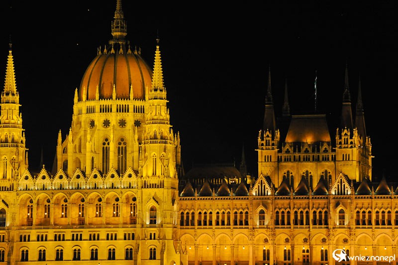Budapeszt. Pięknie oświetlony nocą budynek Parlamentu, znajdujący się nad brzegiem Dunaju.