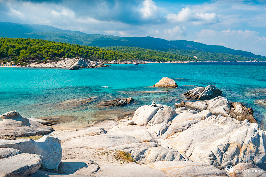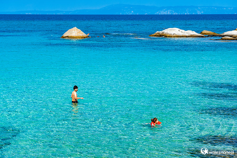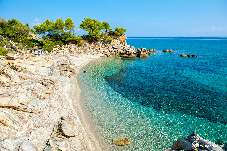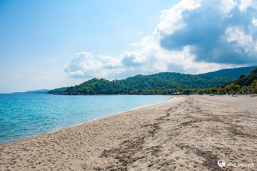 Chalkidiki. Krystalicznie czysta woda i jasny piasek Orange Beach na półwypie Sithonia.