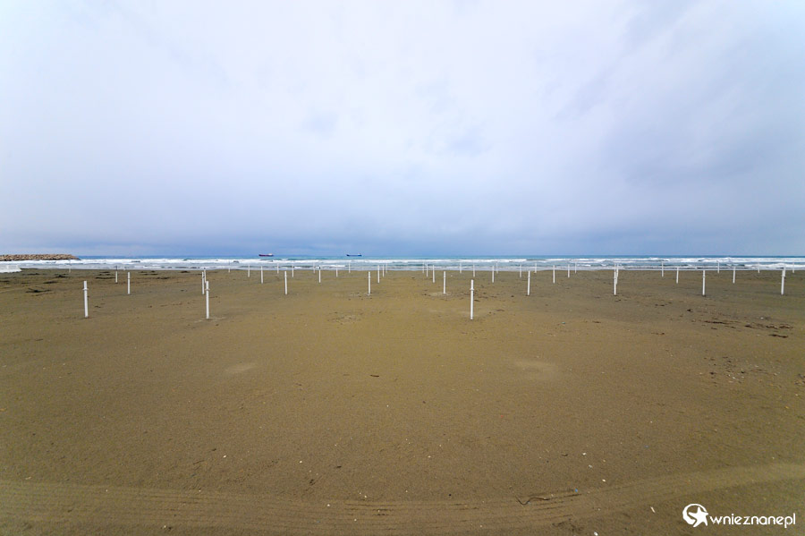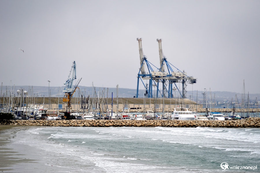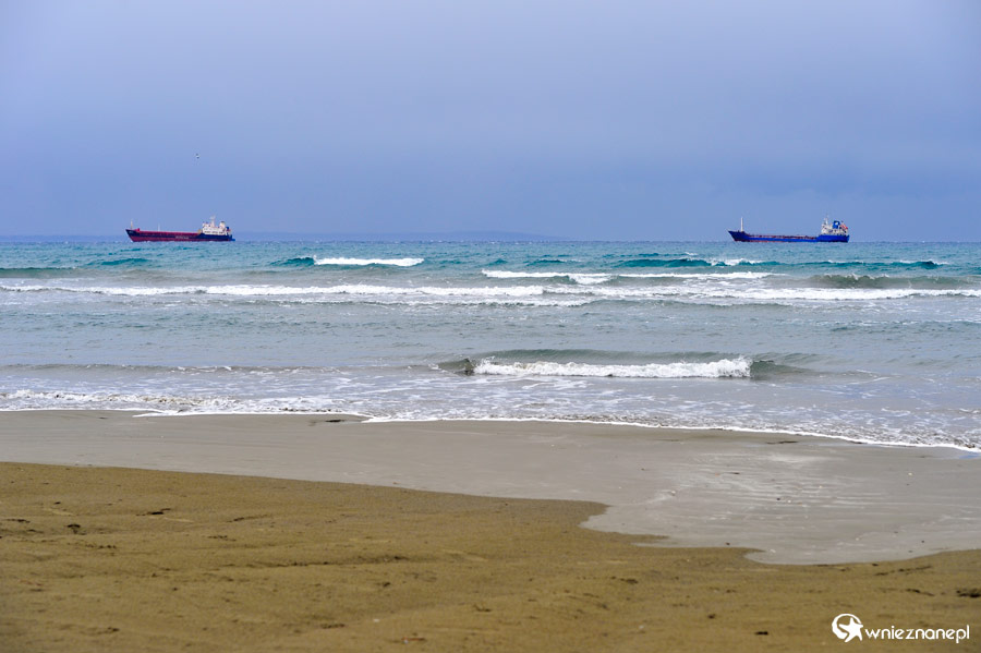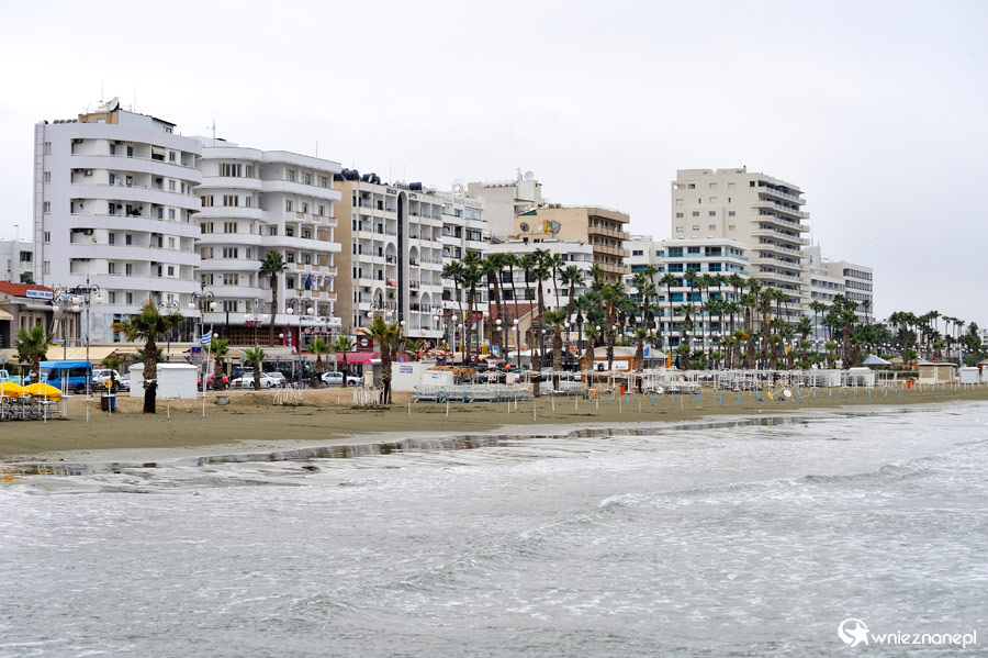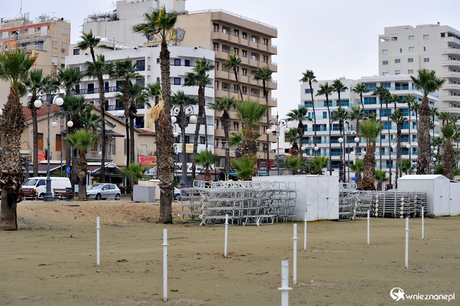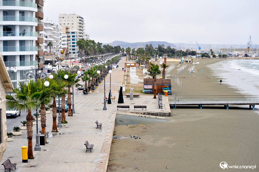 Cypr zimą. Promenada i opustoszała plaża w Larnace.