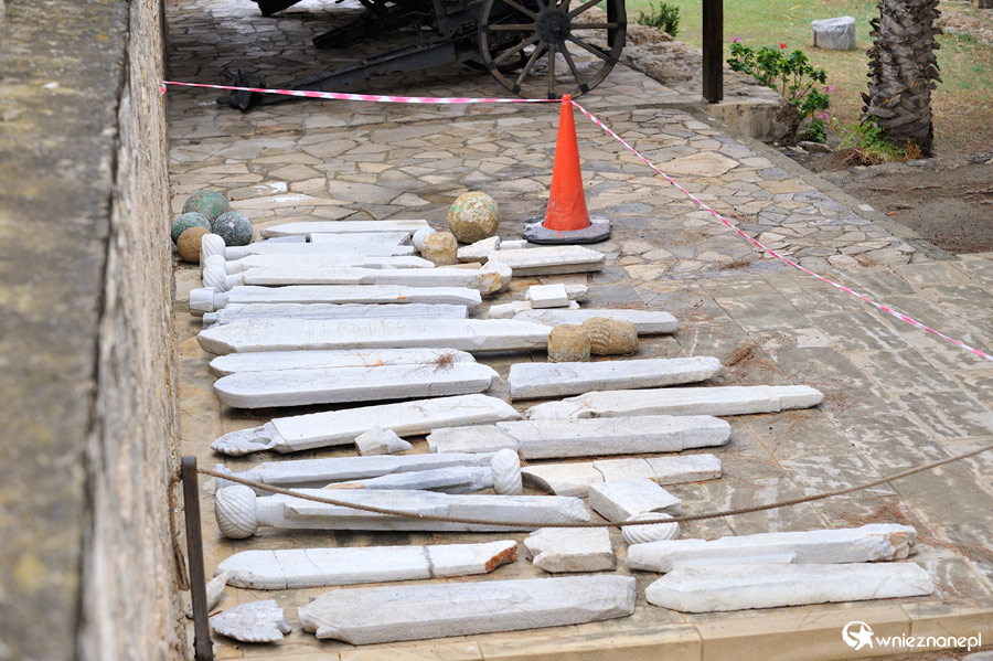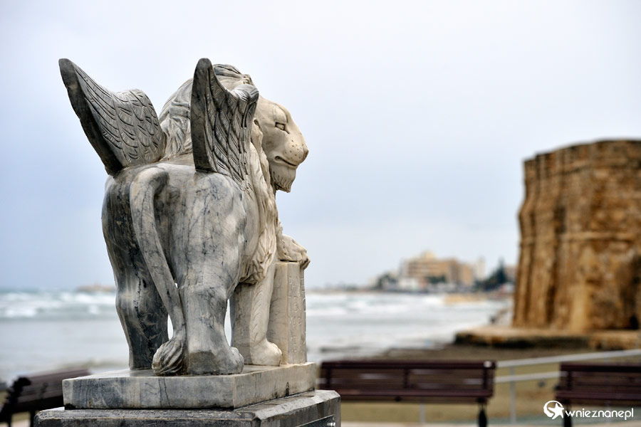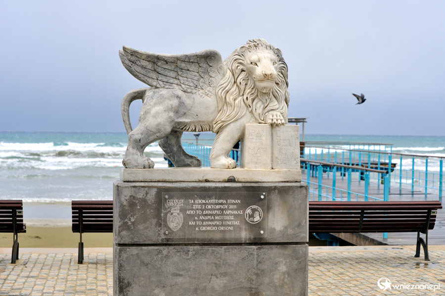 Cypr zimą. Wenecki lew na promenadzie w Larnace.