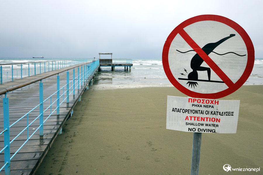 Cypr zimą. Molo i opustoszała plaża w Larnace.