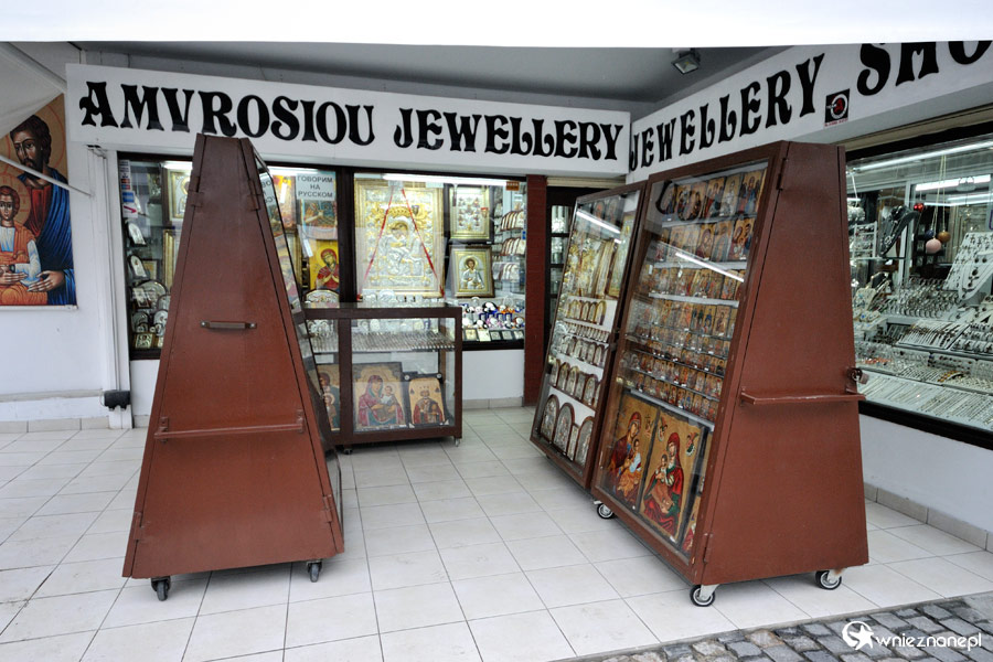 Cypr zimą. Sklep z biżuterią i ikonami w Larnace.