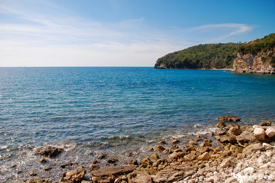 Czarnogóra. Budva. Kamienista linia brzegowa odcina Budvę od morza.