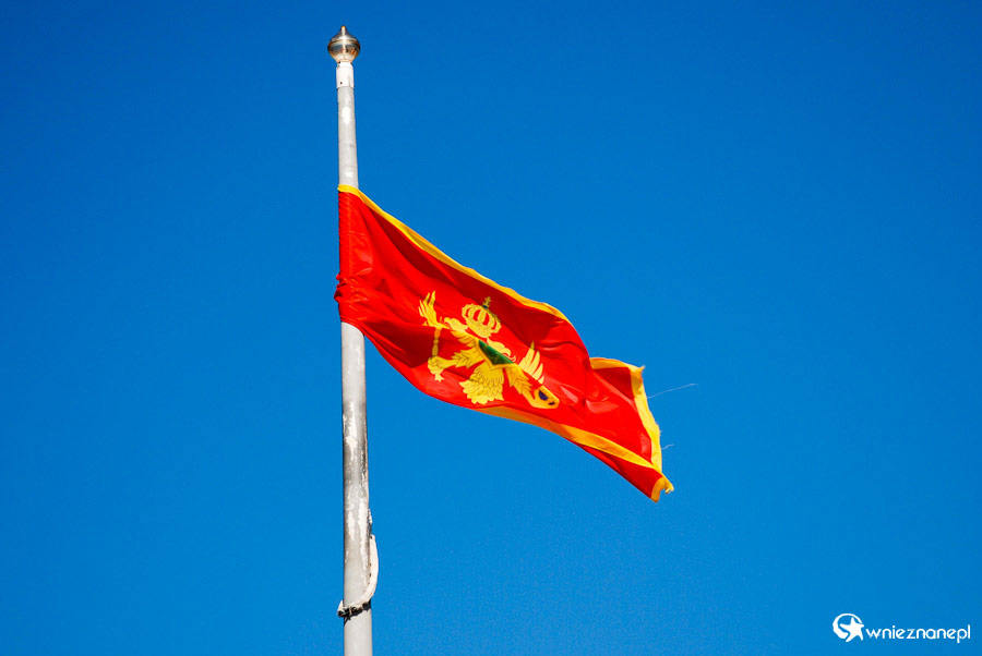 Czarnogóra. Budva. Powiewająca na wietrze flaga Czarnogóry.