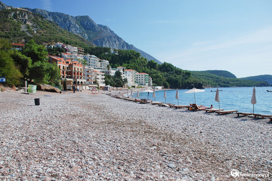 Czarnogóra. Sveti Stefan. Kamienista plaża w pobliżu wyspy św. Stefana.