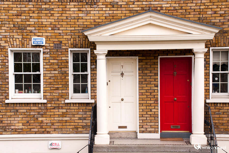 Dublin. Dzielnica Kilmainham. Biało-czerwone drzwi wejściowe do kamienicy.